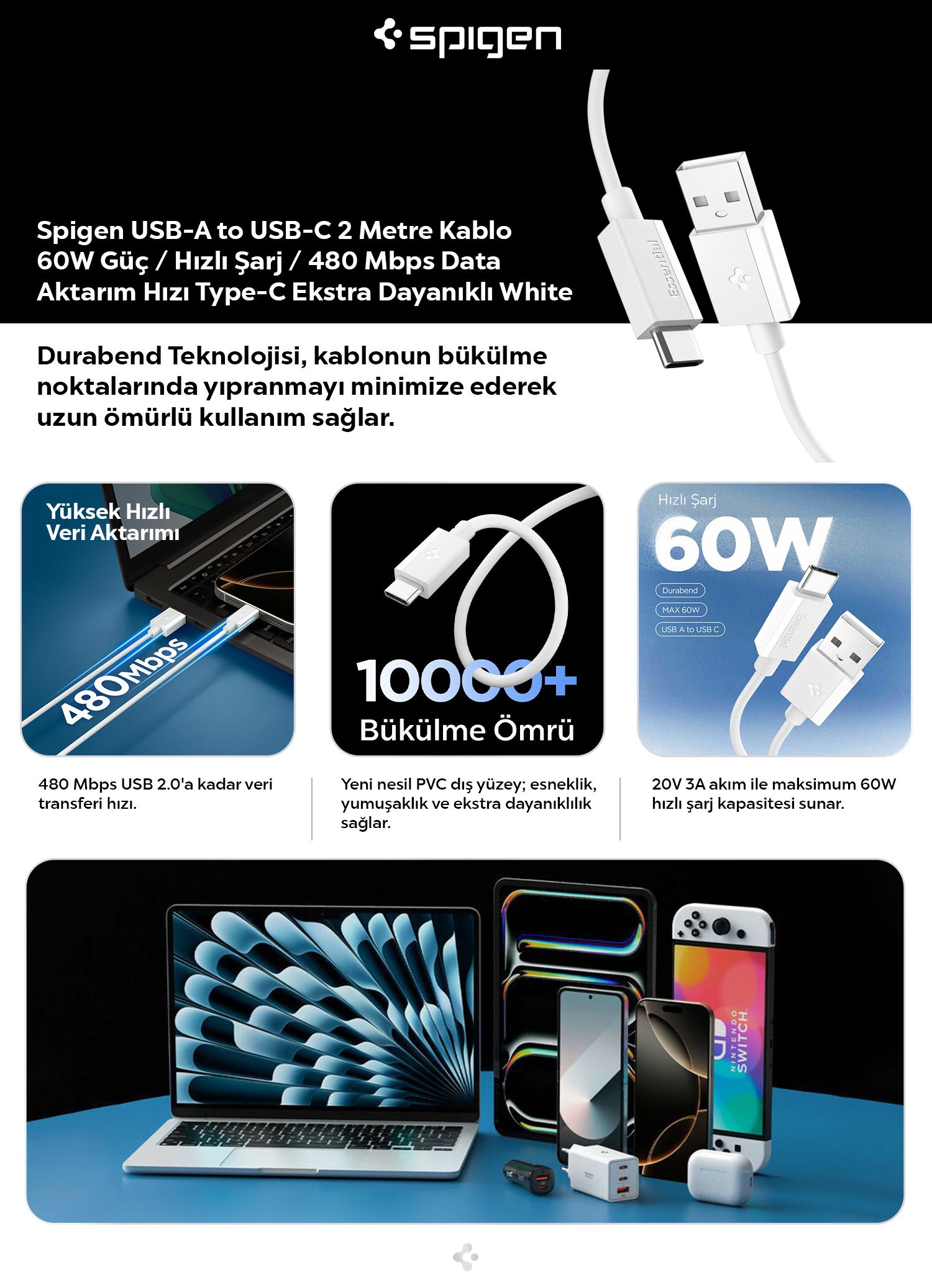 Spigen'in özel Durabend Teknolojisi, kablonun bükülme noktalarında yıpranmayı minimize ederek kullanım sağlar.