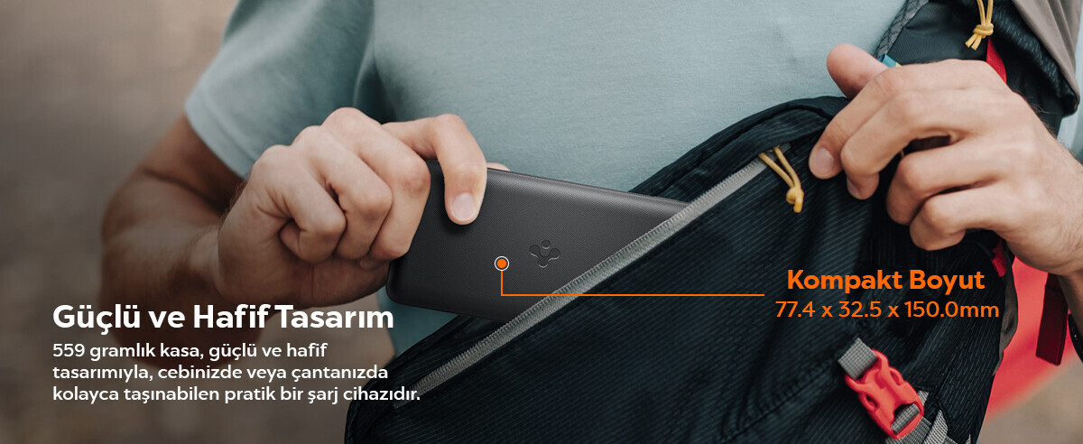 - ? 559 gramlık şık tasarımıyla, cebinizde veya çantanızda kolayca taşınabilen pratik bir şarj cihazıdır.