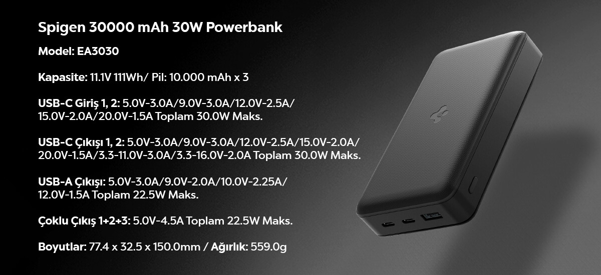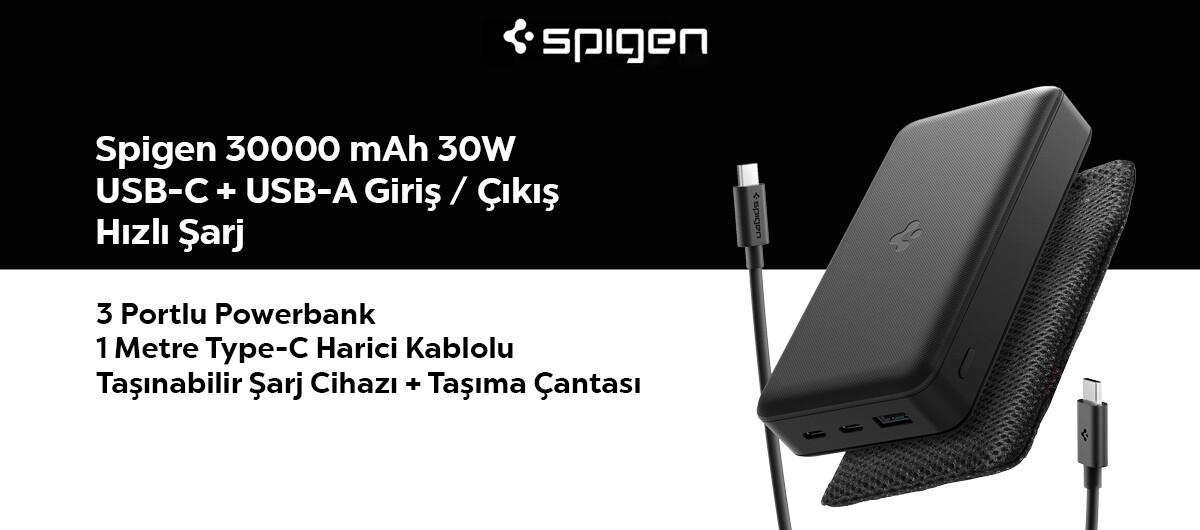Tasarım: Güçlü ve Şık tasarımı sayesinde evde, ofiste veya seyahatte rahatça taşınabilir. USB-C bağlantı noktası, modern akıllı telefonlar ve tabletlerle tam uyumludur. Spigen Type-C Powerbank 30000 mAh harici pil, 30W USB-C hızlı şarj desteği, üç port avantajı ile her an yanınızda güçlü ve pratik bir şarj çözümü sunar.