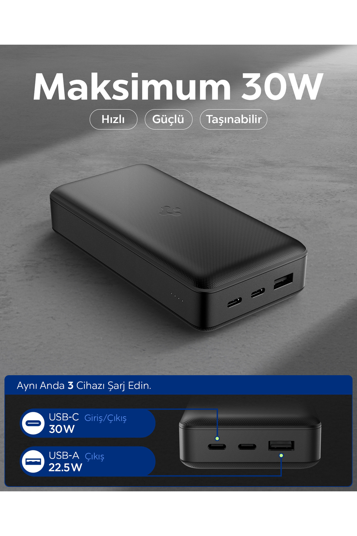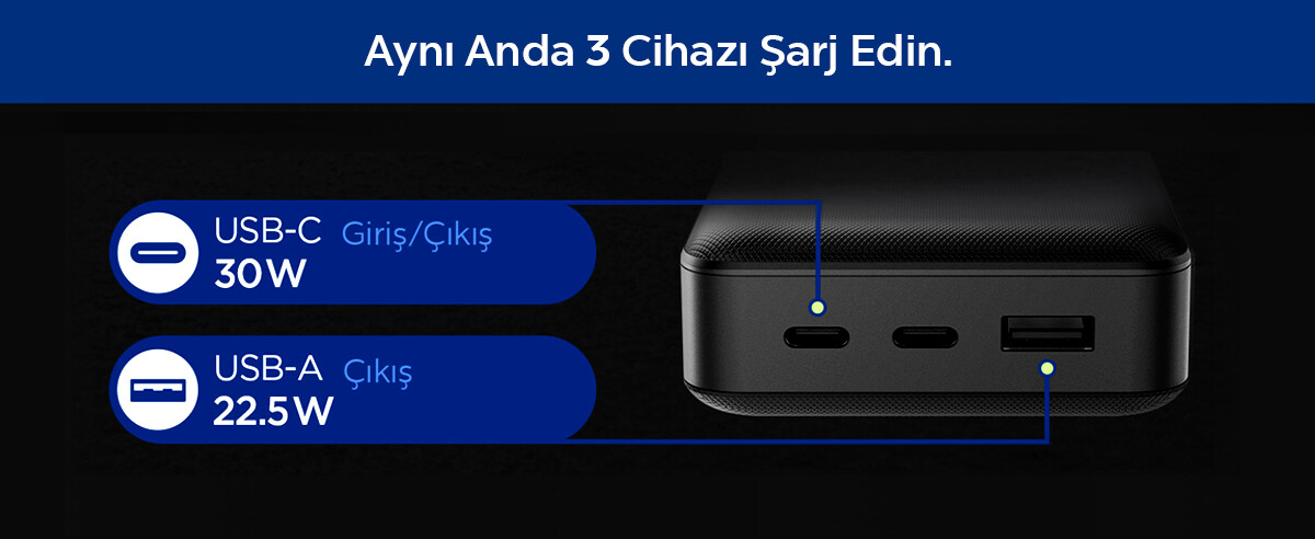 Üç Cihazı Aynı Anda Şarj Et: 30W USB-C çıkışıyla telefon, tablet, kulaklık veya akıllı cihazlarınızı hızlıca şarj edebilir, 30W giriş desteği sayesinde ise kendi bataryasını yaklaşık 4 saatte tam doldurarak yeniden kullanıma hazır hale gelir. Hem kendisini hem de cihazlarınızı hızlı şarj edebilme özelliğiyle her an enerjiye kolayca ulaşmanızı sağlar. Güç aktarımı sırasında istikrarlı performans sağlayarak şarj süresini kısaltır, böylece her an yanınızda güçlü ve güvenilir bir enerji kaynağı bulundurmanıza imkân tanır. Güçlü ve dayanıklı yapısı sayesinde her yerde yanınızda olur ve hareket halindeyken enerjiyi daima erişilebilir kılar, böylece priz arama derdini ortadan kaldırır. Üzerindeki USB-C + USB-A Giriş / Çıkışı sayesinde aynı anda 3 farklı cihazı kolayca şarj etme imkânı sunar. Telefon, tablet, kulaklık veya taşınabilir diğer elektronikleriniz için ayrı ayrı priz aramanıza gerek kalmaz.