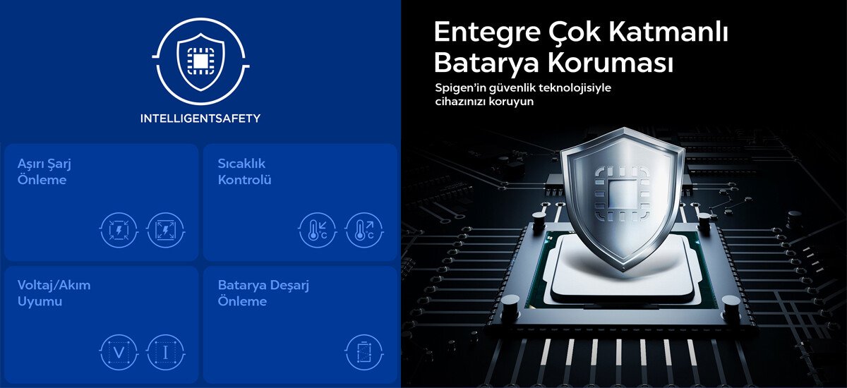 Entegre Çok Katmanlı Batarya Koruması: Spigen'in gelişmiş güvenlik teknolojisi, cihazlarınızı çok katmanlı koruma sistemi ile güvence altına alır. Birden fazla koruma için tasarlanmış dahili akıllı şarj denetleyici, elektronik cihazlar için sağlam koruma sunar. Aşırı şarjı önleyerek bataryaların ömrünü uzatır, sıcaklık kontrolüyle güvenli bir şarj ortamı sağlar. Voltaj ve akım uyumu sayesinde cihazlarınıza her zaman doğru miktarda enerji aktarılırken, batarya deşarj önleme özelliğiyle enerji kaybı en aza indirilir. Bu çok yönlü güvenlik sistemi, uzun süreli ve güvenilir bir kullanım deneyimi sunar.