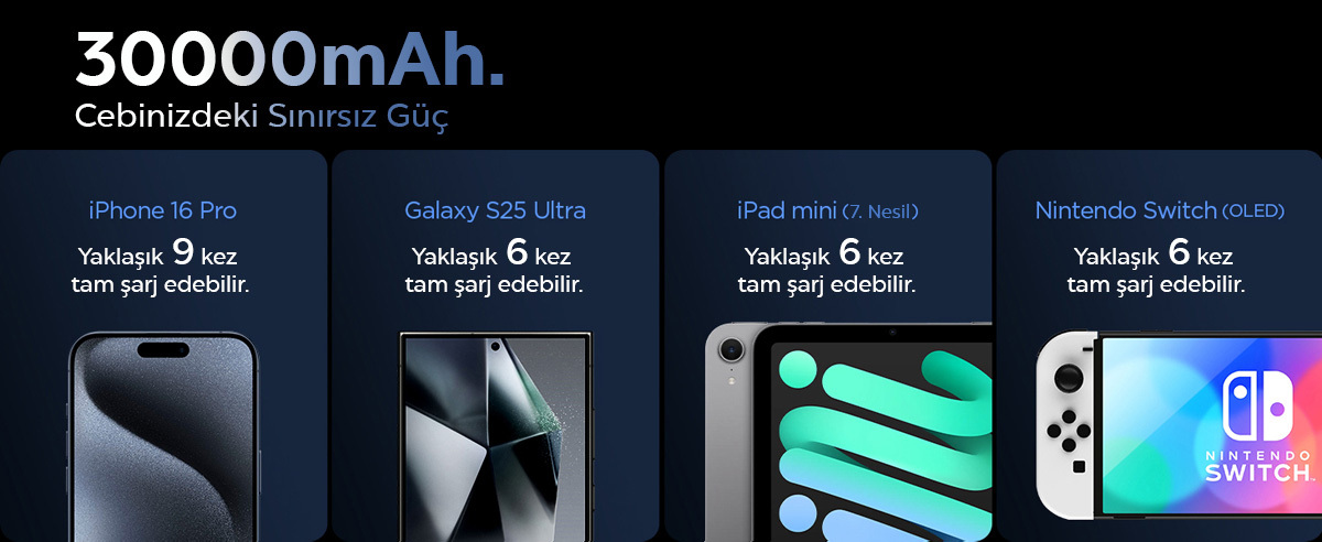 Cebinizdeki Sınırsız Güç: 30.000 mAh kapasitesiyle günlük ihtiyacınızdan çok daha fazlasını sunan bu powerbank, telefon, tablet ve diğer cihazlarınızı defalarca şarj ederek gün boyu kesintisiz enerji sağlar. iPhone 16 Pro'yu yaklaşık 9 kez, Galaxy S25 Ultra'yı yaklaşık 6 kez, iPad mini (7. nesil) ve Nintendo Switch (OLED)'i yaklaşık 6 kez tam şarj edebilir. (Şarj süreleri; cihazın güç profiline, kablo/port seçimine ve kullanım koşullarına göre değişir.) Spigen Hızlı Powerbank, 30W USB-C + USB-A Giriş / Çıkış hızlı şarj desteği ve 3 Port desteği ile akıllı telefon, tablet, bilgisayar, kulaklık, oyun konsolu ve birçok akıllı cihazı hızlıca şarj eder. Seyahatlerde ve kalabalık ortamlarda kullanıcıya büyük kolaylık sağlar.