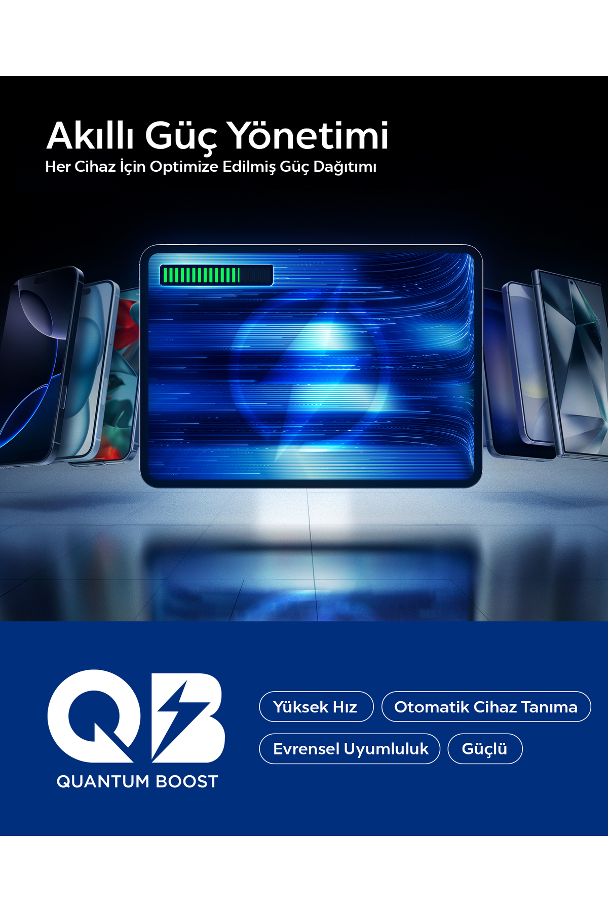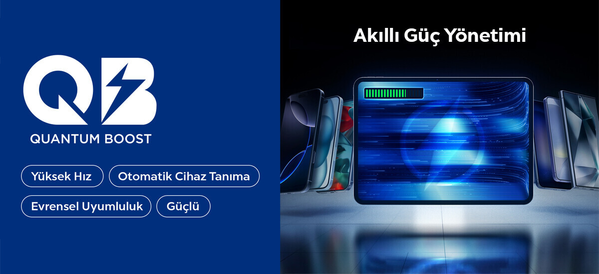 Quantum Boost Akıllı Güç Yönetimi: Cihaza uygun güç çıkışı sağlayarak güvenli ve hızlı şarj imkanı sunar. Hem verimliliği artırır hem de güvenliği garanti altına alır.